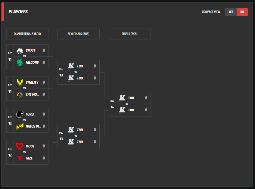 По итогам стадии в плей-офф вышли следующие коллективы: Spirit, FURIA, MOUZ, Vitality, The MongolZ, FaZe, Natus Vincere и Falcons. Они продолжат борьбу за титул и крупнейшую часть призового фонда в $1 250 000 в финальной стадии, которая пройдёт с 11 по 14 декабря в MVM Dome.